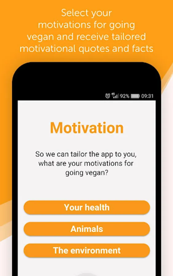 * Choose your motivation for going vegan and be kept on track with new quotes and facts tailored to your reasons for going vegan, each time you open the app.