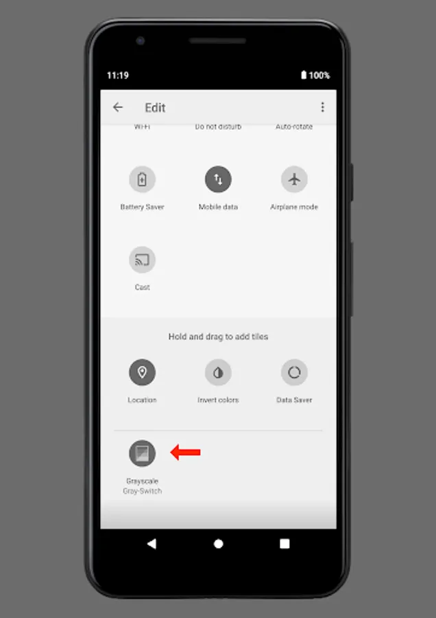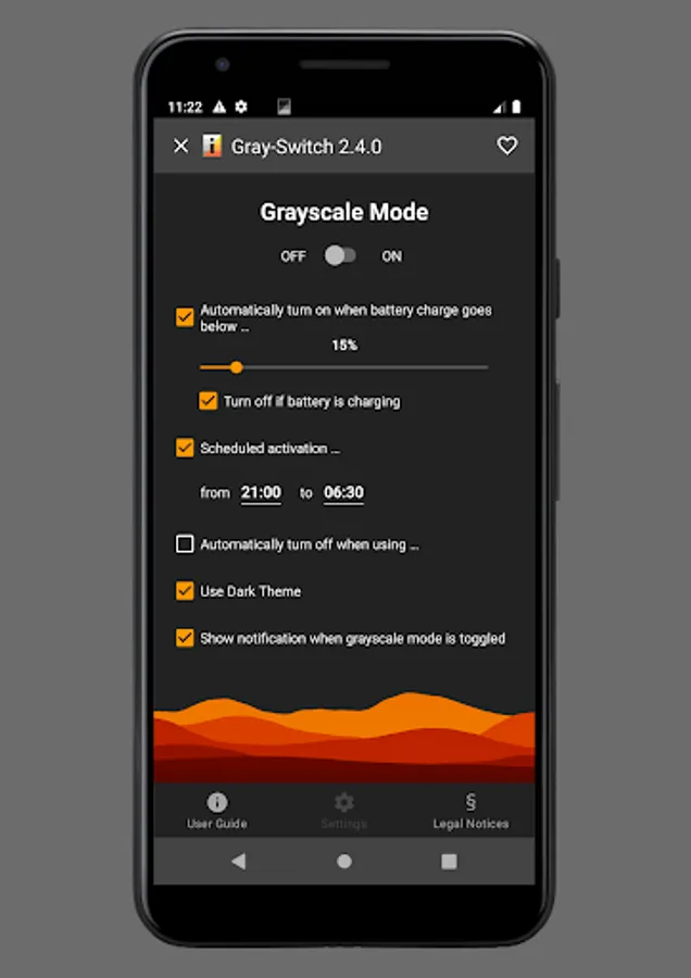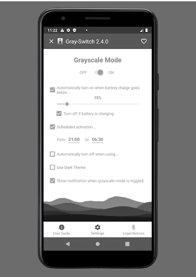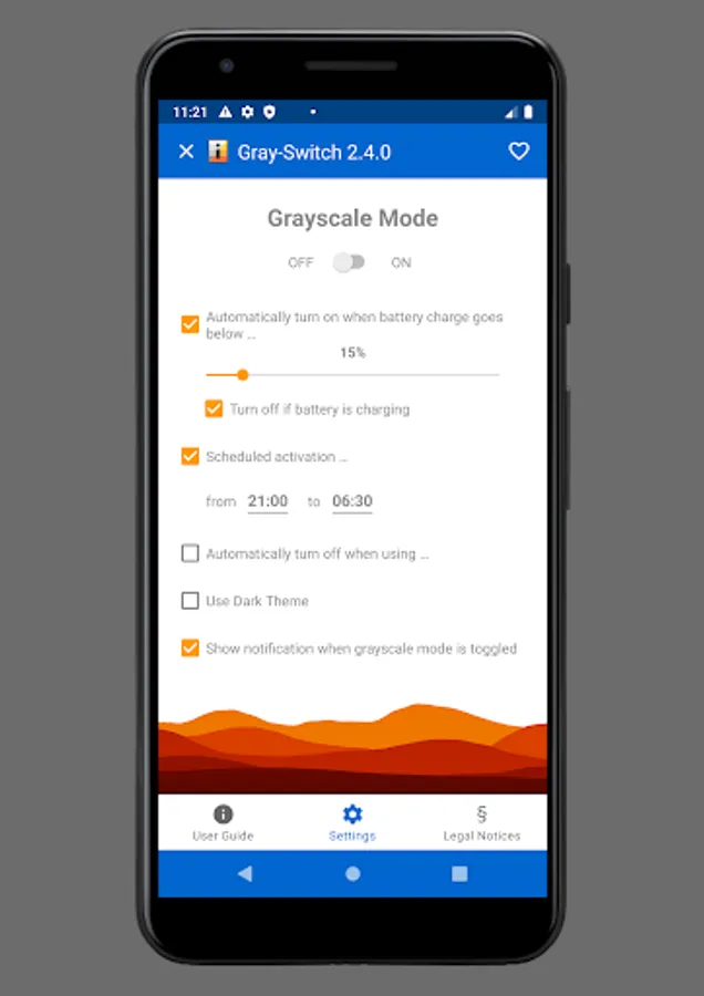 Gray-Switch allows you to conveniently switch your device's display mode between full color and grayscale either using a quick settings tile (Android 7 or newer), a launcher icon, automatically when the battery charge has fallen below a configured value, and/or during a configurable time schedule (e.g. at night time).