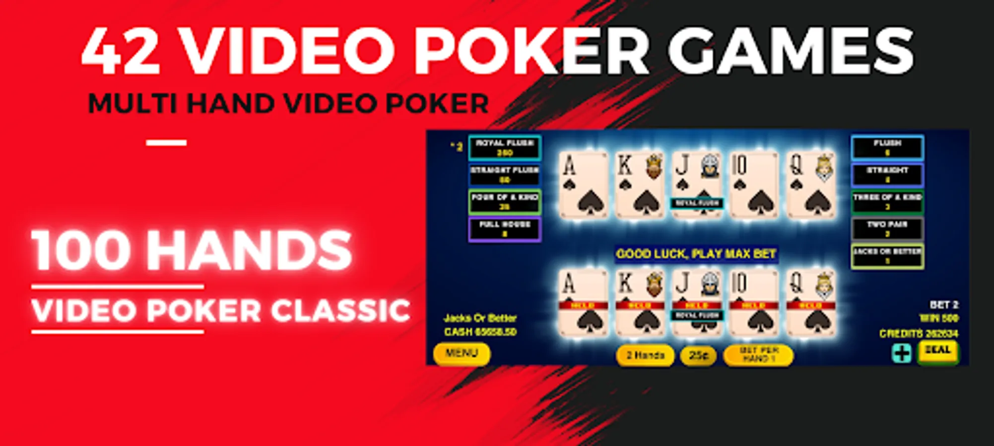 42 video poker games varying from Jacks or Better, Deuces wild, Joker poker to Super Double Bonus Poker in one game