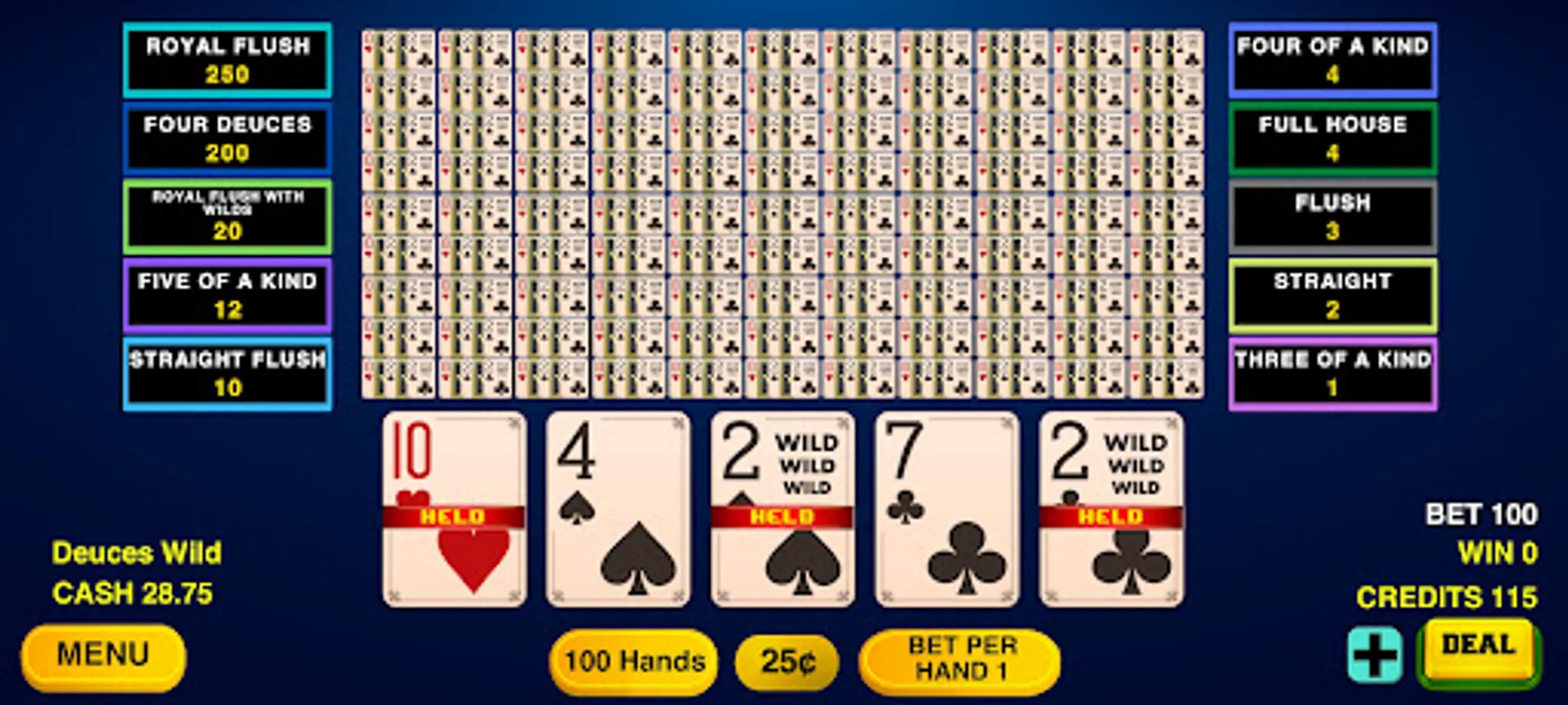- Play upto 100 hands