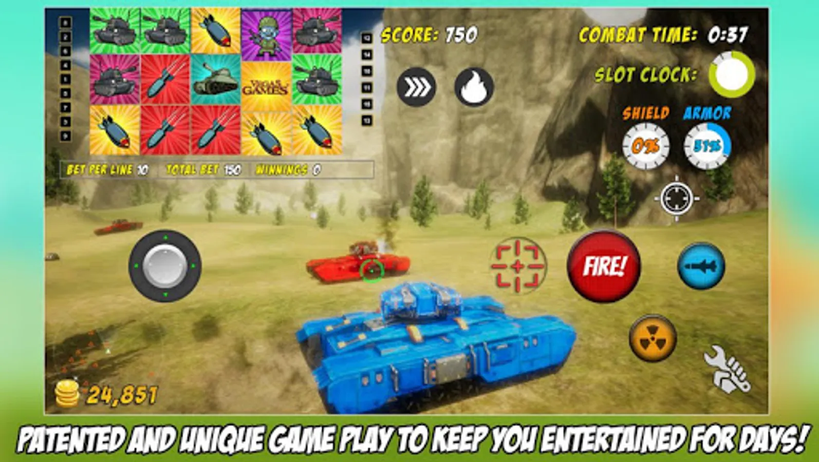 • With Tank Skill Slotz, the action keeps going and the slots keep spinning for as long as you can destroy the enemy tanks!