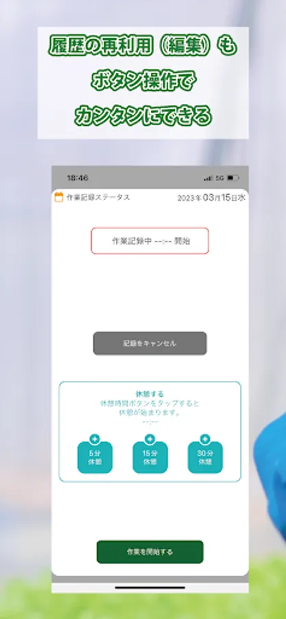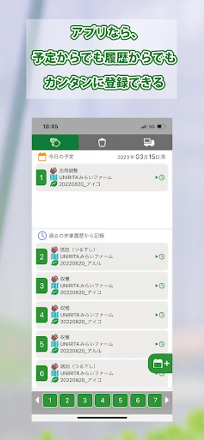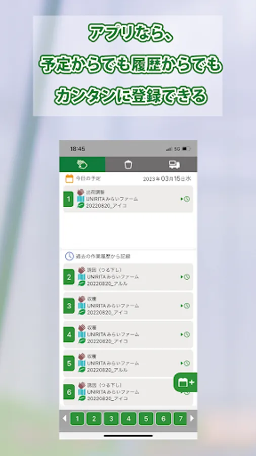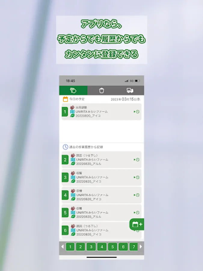 Conventionally, it was necessary to individually set and register information about "when, who, which field (planting), what work was done, and how long it took" to record farm work. With this application, you can create a work schedule by editing only the necessary items based on the most recent work record (history). By tapping the work start / end button of the created work schedule, the work record is automatically created.