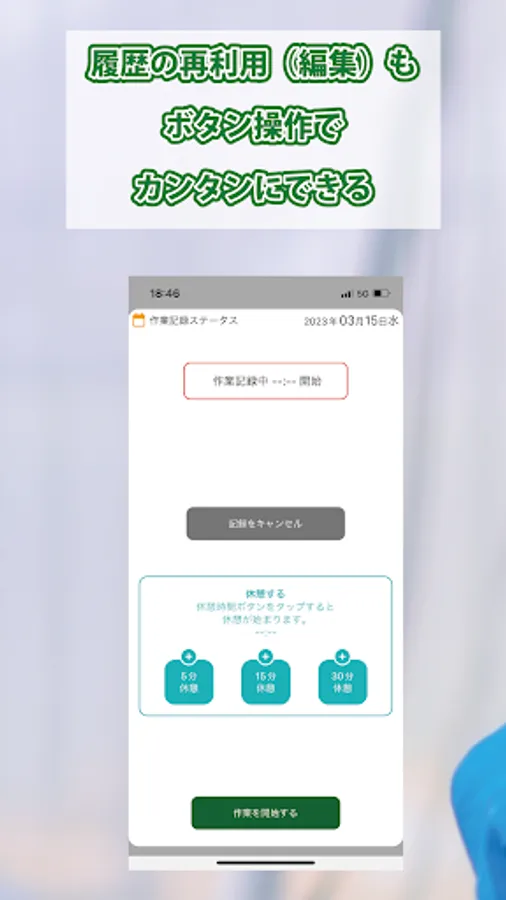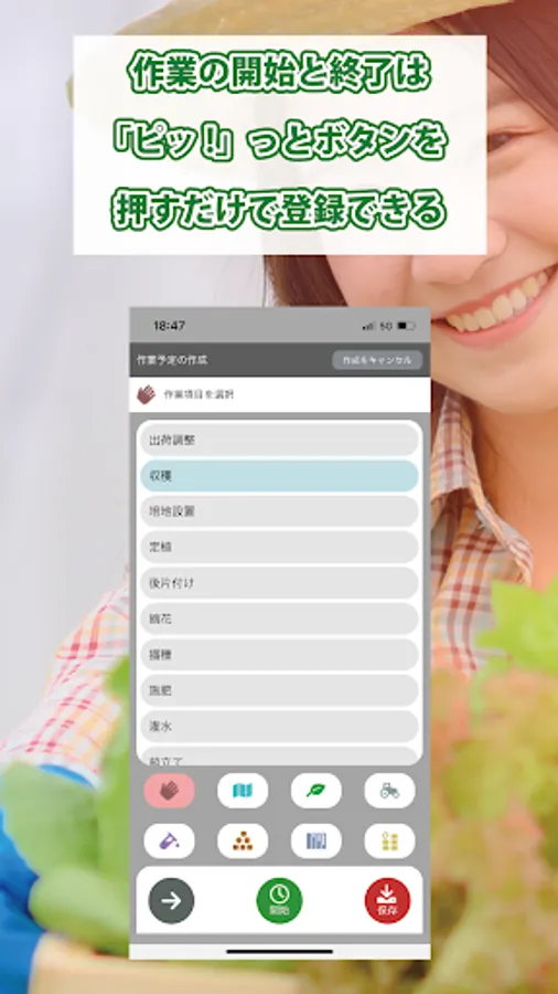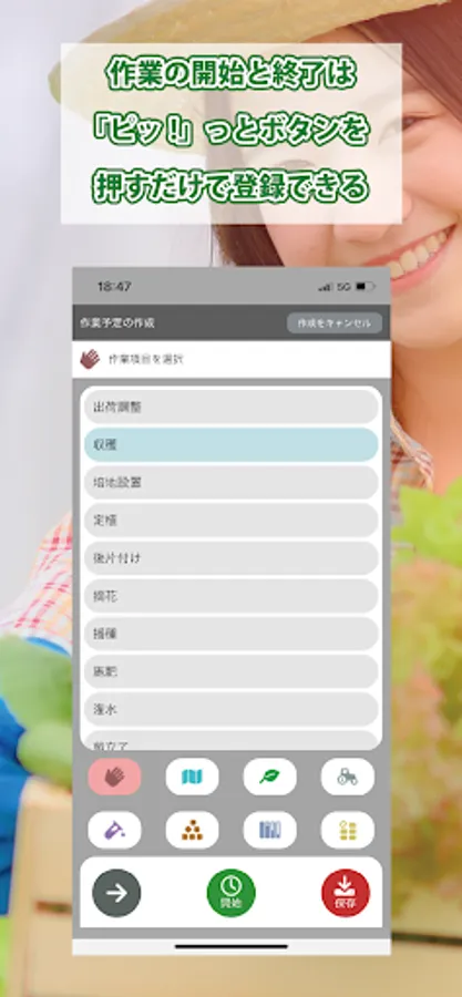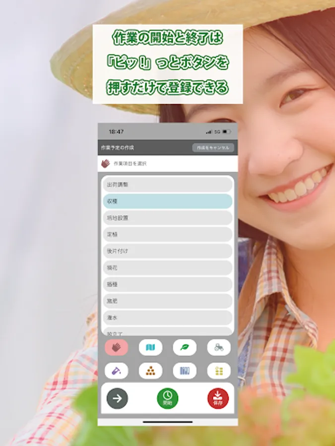 Start the application according to the start of farm work. Press the "Start" button to start work, and the "Finish" button to finish work. The time you tapped on the start and end will be reflected in the "Veggie Palette" as a record of the work, so you can easily create a work record on site! Not only farm work, but also harvesting and shipping registration can be easily performed on-site by following the screen operations.