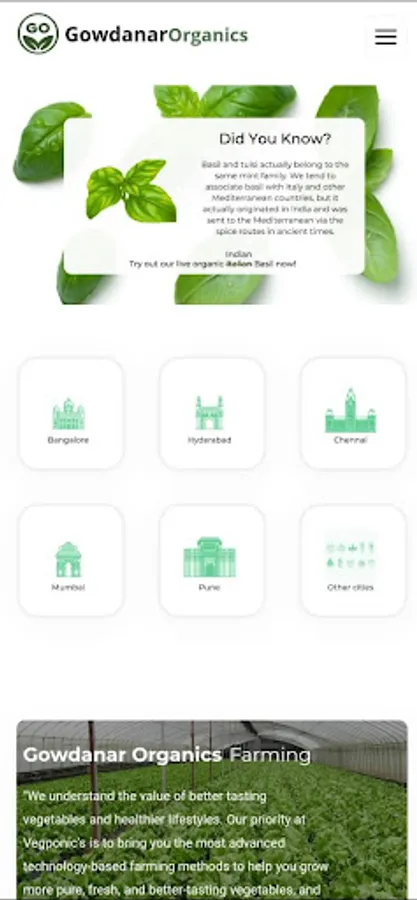 Gowdanar Organics pioneers in the lift & shift and nano technology in India. We grow the crops until they are ready to be harvested and immediately transport it to your house. We have removed the hassle of transporting the crops as soon as they have been cut. The plants grow until you wish to cut and use them so there is no substitute for freshness. The organic products include Coriander, Spinach, Methi, Basil, Dill, Oregano, Mint and even mushrooms!