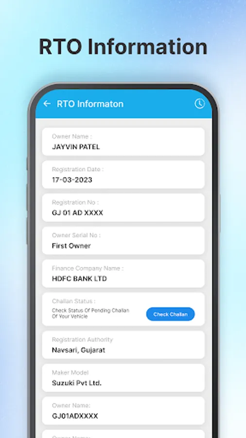 RTO Vehicle Information app gives you information of Vehicle owners like name, insurance info, challans info etc.