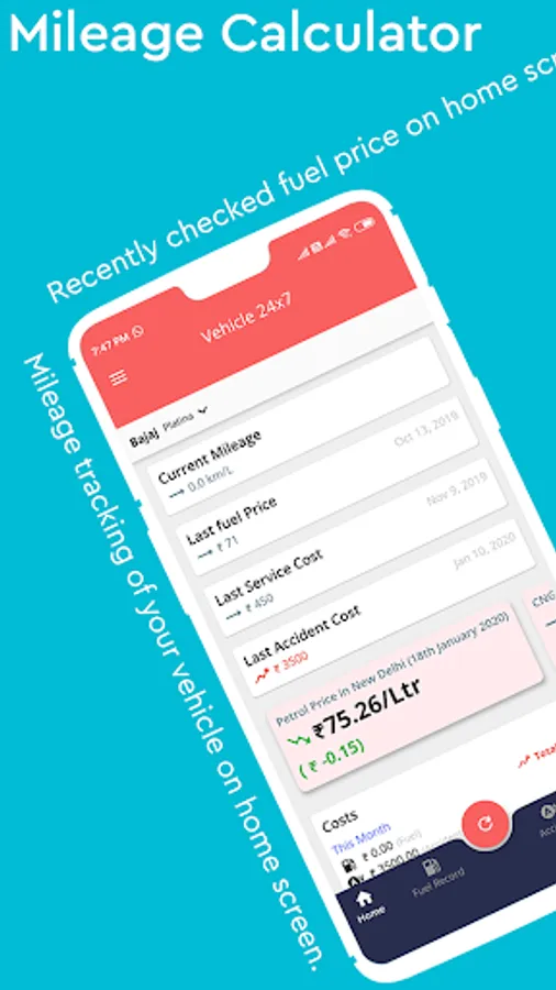 bike mileage calculator -> Track mileage of your vehicle anytime. Mileage will be calculated based on your fuel record. To better track, your vehicle's mileage regularly adds fuel records in the Vehicle 24x7 app. This mileage calculator will help you to determine problems in your vehicle, so that you can do service on time to get better result from your vehicle and save money spent on fuel. Almost new vehicles are coming with built-in mileage calculator, but old vehicle doesn't have any mileage calculator mechanism. In this case, Vehicle 24x7 app will work as a mileage calculator for your bike, car or any other vehicle.