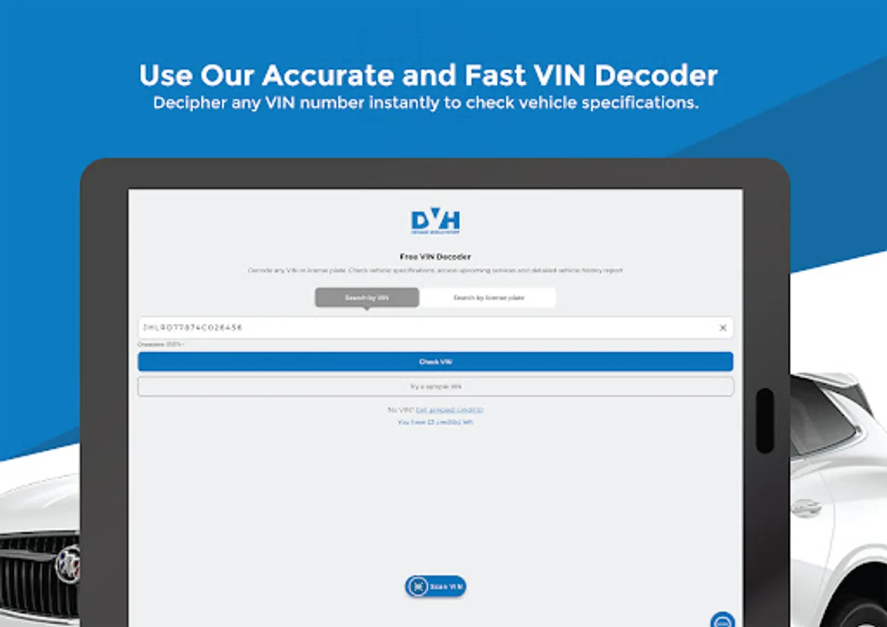A quick and easy way to decode VIN and generate vehicle history for used vehicles. Use our trusted VIN decoder to access vehicle specifications for free. Run a VIN check now.