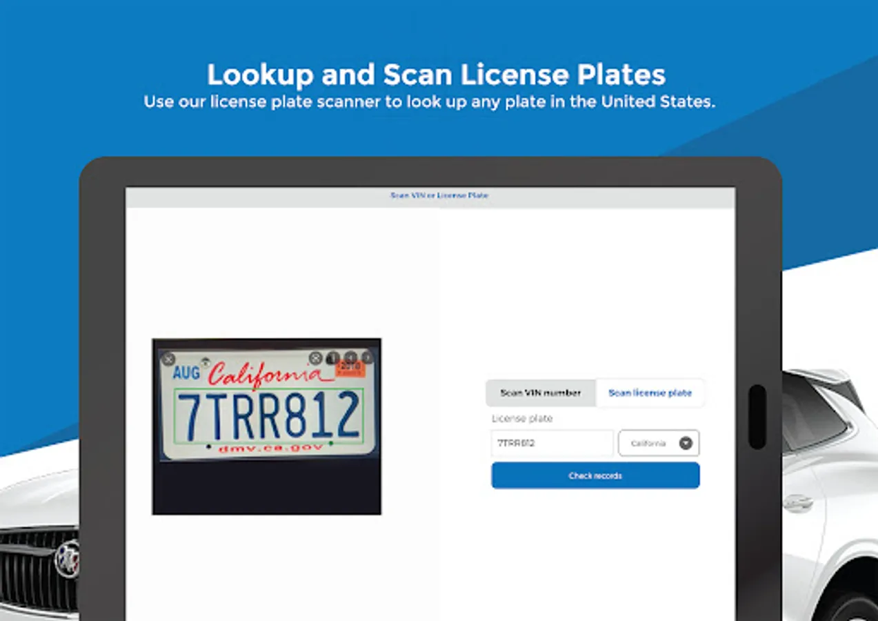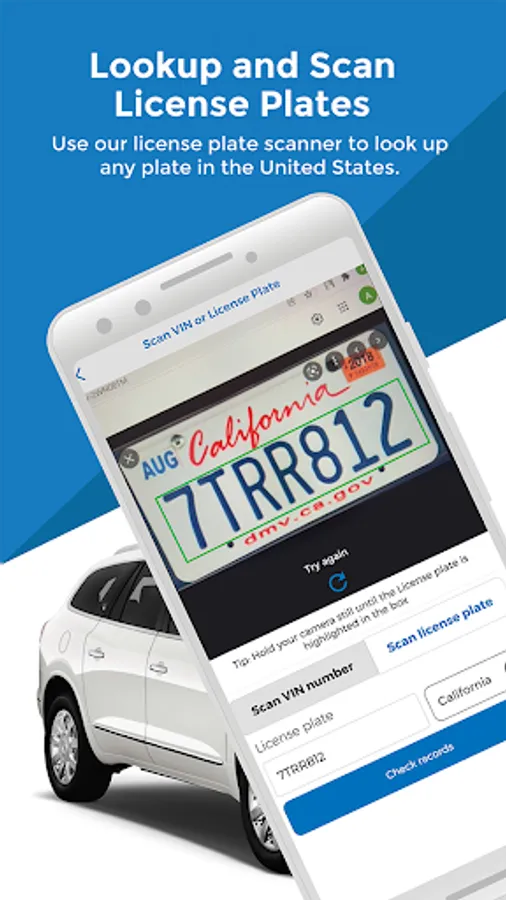 On the “Search Page”, click “Search by license plate” to enter the plate number and State or do a license plate scanning by using the “Scan Plate” option.