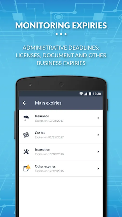 Scheduling maintenances accurately is very important if you want to manage an efficient fleet. With Veicoli Business you can assign any vehicle expiries, that can be regular events (insurance, tax, service, maintenance, inspection, periodic monitoring) or event with a spedific date (unscheduled maintenance, carwash, repair work, etc..)