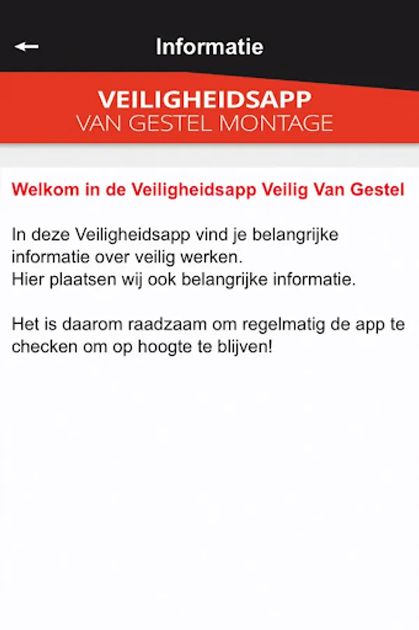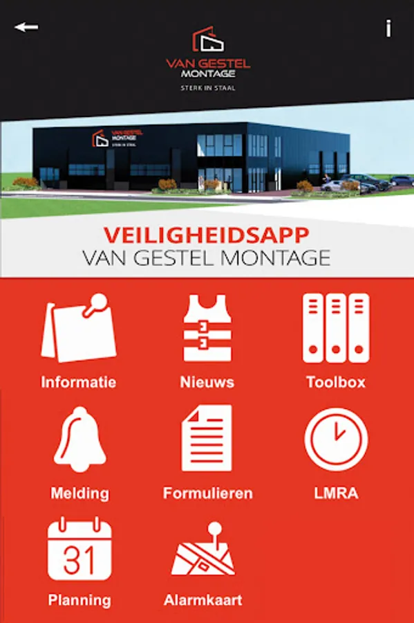 This is the Van Gestel Montage Safety App. This contains everything about what to do in the event of unsafe situations and unsafe situations can be reported. New information about safe working is regularly placed in this app and workplace inspections can be carried out.