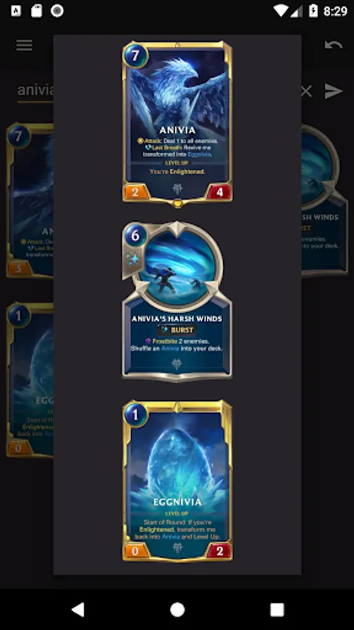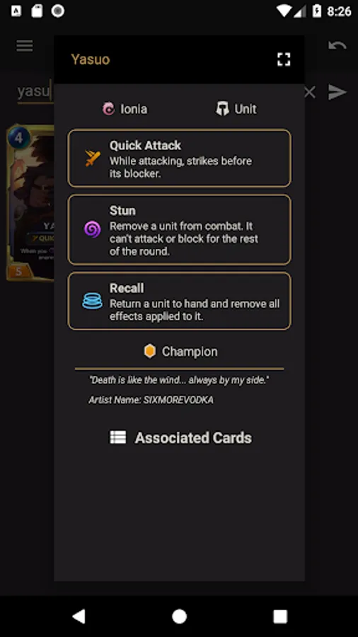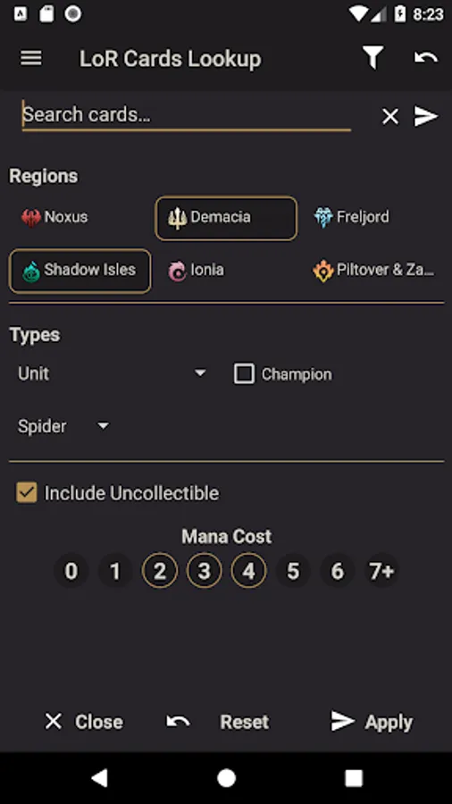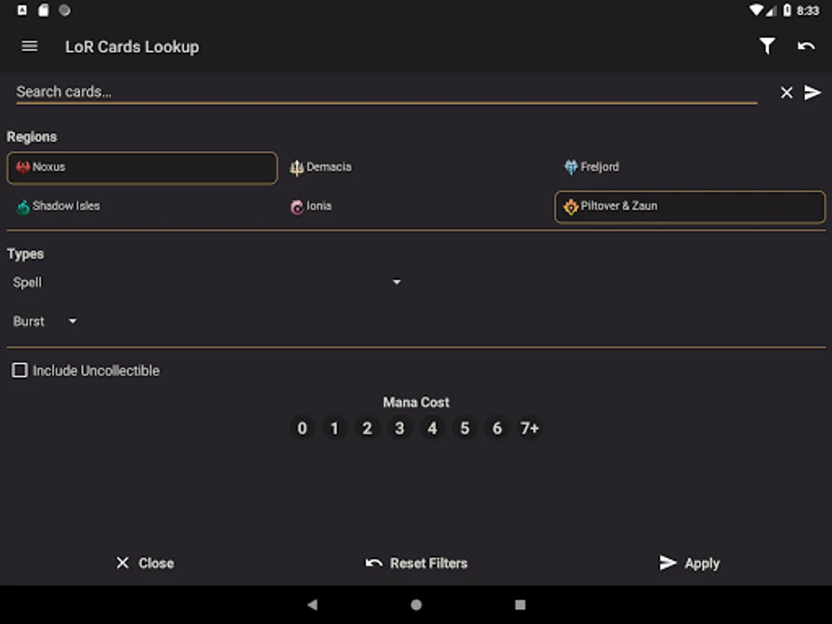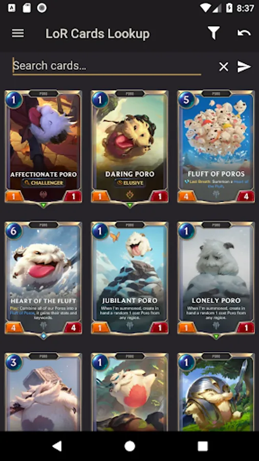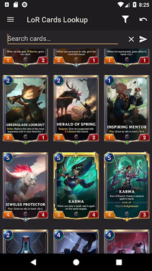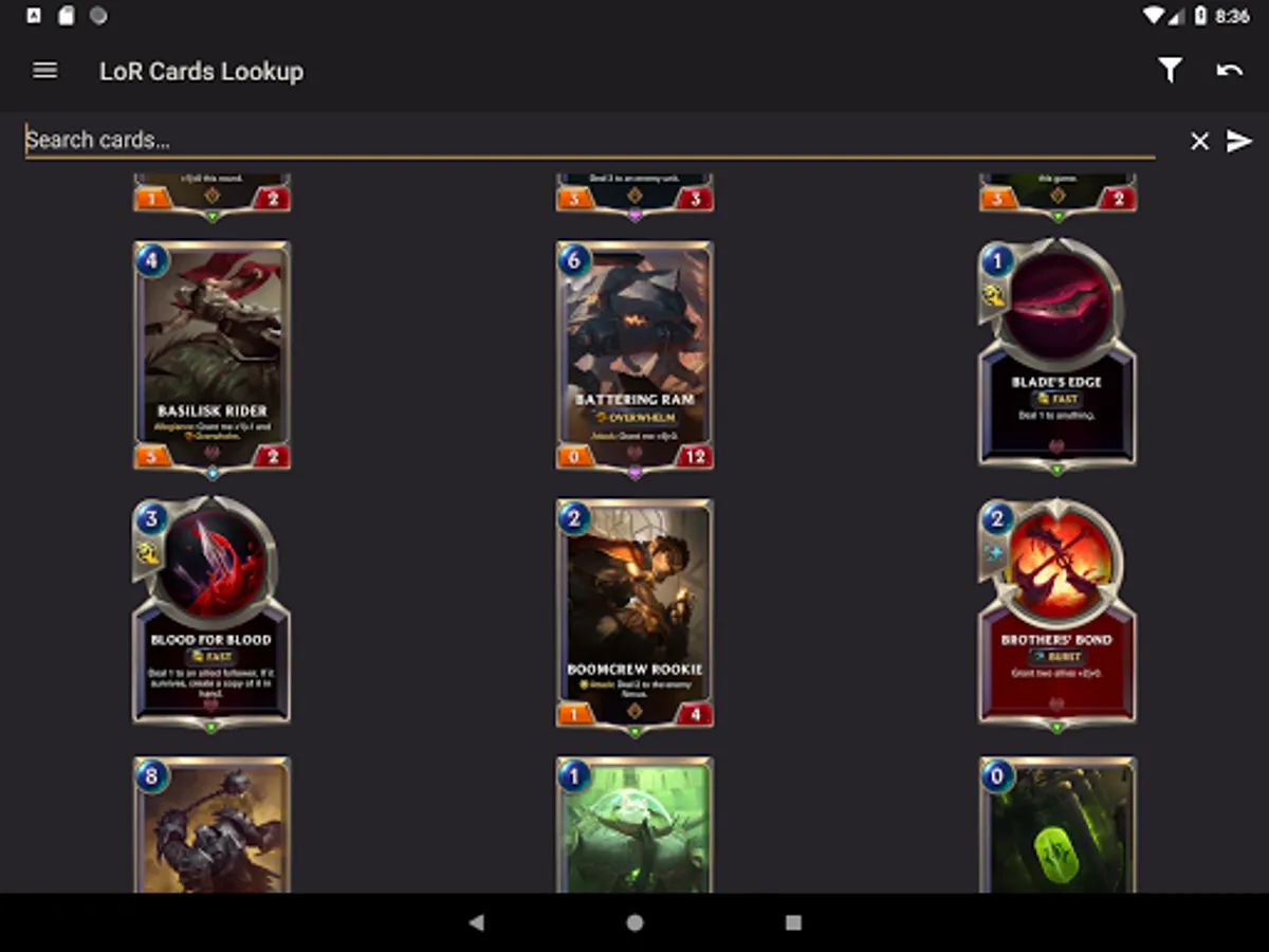 Intuitive UI lets you find the cards fast. Search by: name, keyword, description, regions, mana cost, card type and subtype.