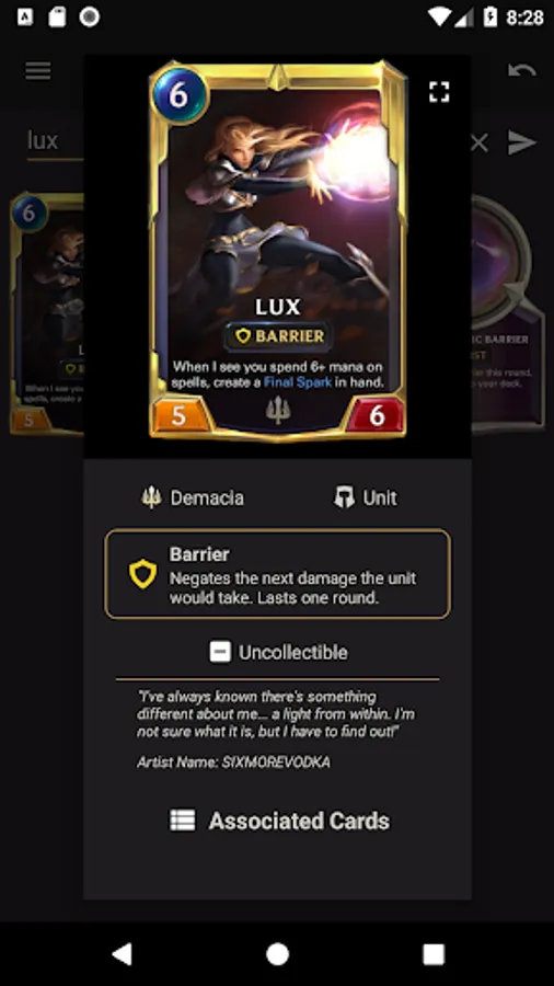 See description of the card's keywords, its associated cards and trivia like flavor text and fullscreen image!