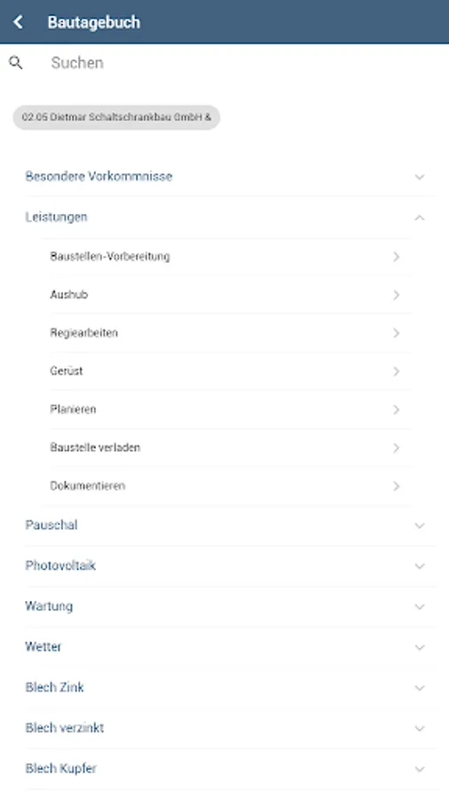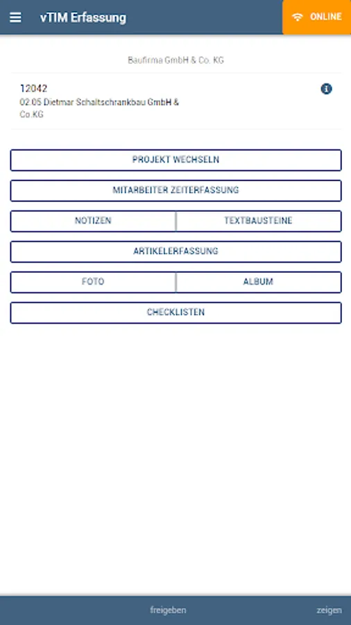A performance record or other information about the project can be entered using the text modules. Photos taken in the app are automatically assigned to the project and are sent directly to the TIM time recording software. Photos from the album can also be assigned to the project on site. Depending on the setting in the TIM time recording, the bookings are provided with the current location information. Location tracking can be activated. The data thus determined are not passed on to the outside world and are only used for the automatic creation of bookings.