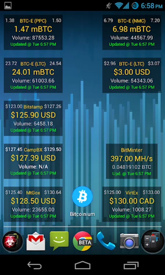 Track your favorite crypto-currencies (Bitcoin, Litecoin, Dogecoin, etc...) with ease directly from your Android smartphone!