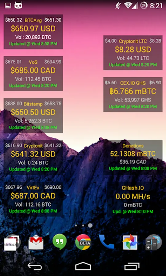 Track your favorite crypto-currencies (Bitcoin, Litecoin, Dogecoin, etc...) with ease directly from your Android smartphone!