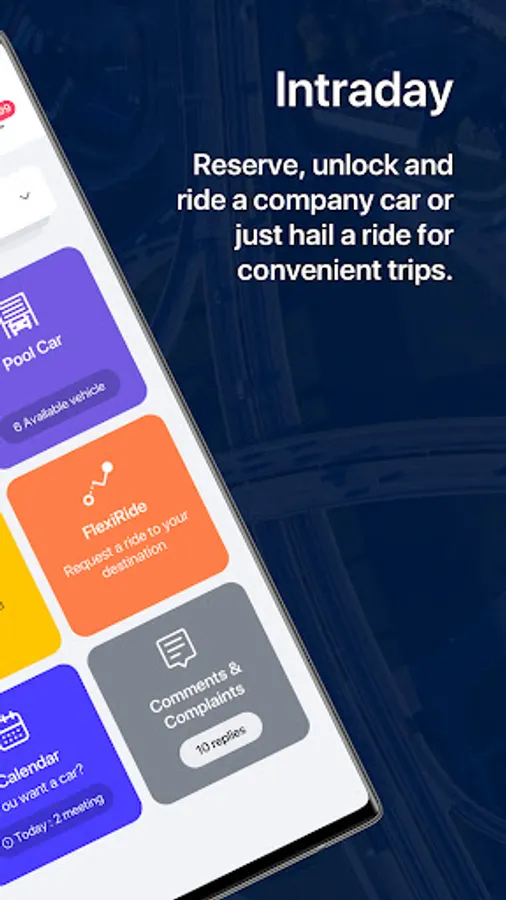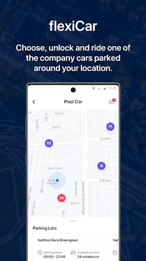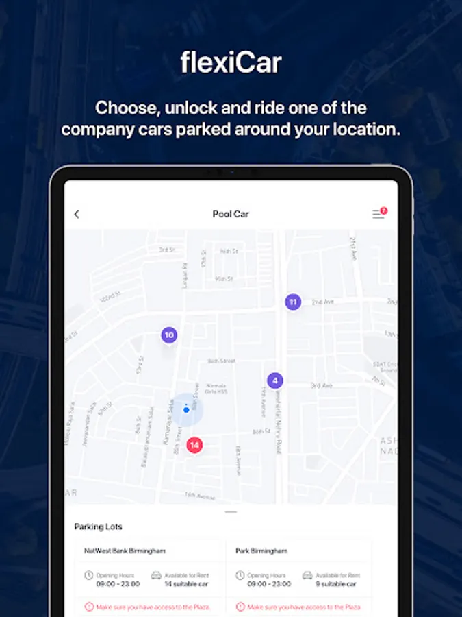 ● Reserve, unlock and drive a company or campus pool car with flexiCar.