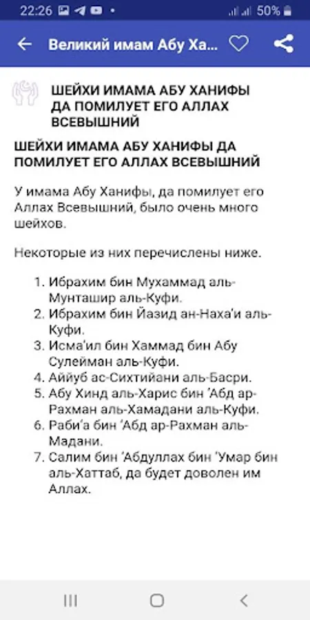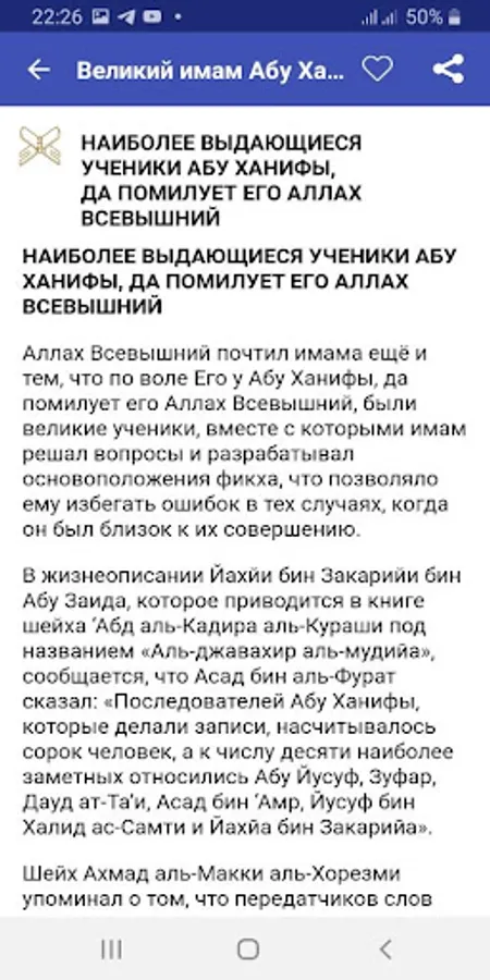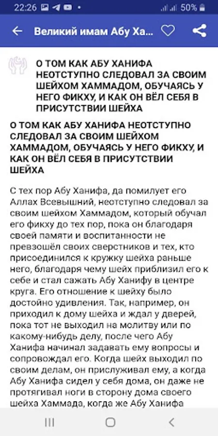 Born in the city of Kufa in the family of a wealthy silk merchant of Iranian origin (from the Iranian mawali) and, most likely, was the only son of his parents. His grandfather converted to Islam during the time of the caliph Umar ibn al-Khattab. In Kufa, Abu Hanifa received a general and theological education. Among his teachers were the companions of the Prophet Muhammad. When Abu Hanifa was 22 years old, he became a student of the Iraqi theologian Hammad ibn Abu Suleiman, in whose circle he spent 18 years until the death of his teacher, and then he headed this circle for ten years, considered the most authoritative fakih of Kufa and Basra.