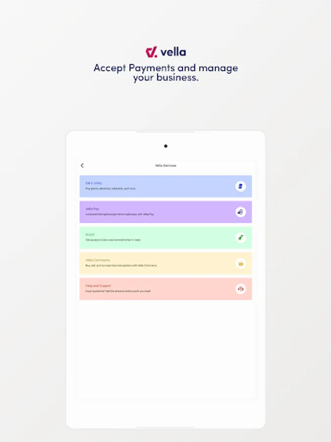 Vella is the new, convenient and easy way to send and receive money,  buy airtime, data, top up friends, pay bills and do business in minutes.