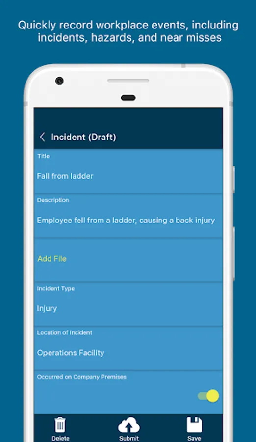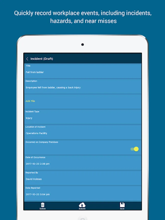 • Report incidents, near misses, hazards and other events in a few quick and easy steps