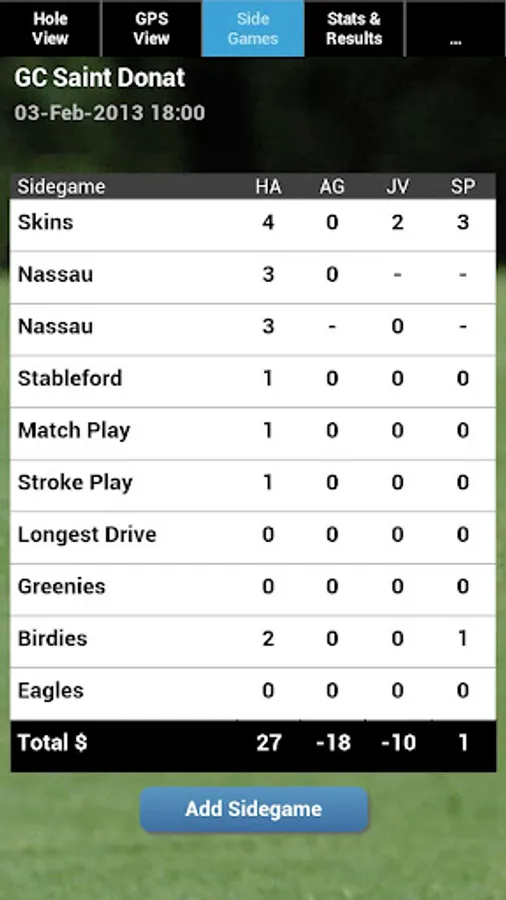 * Wager and play popular side games, including Skins, Nassau, Match Play, Stroke Play, Stableford, Greenies, Longest Drive, Birdies, Eagles.