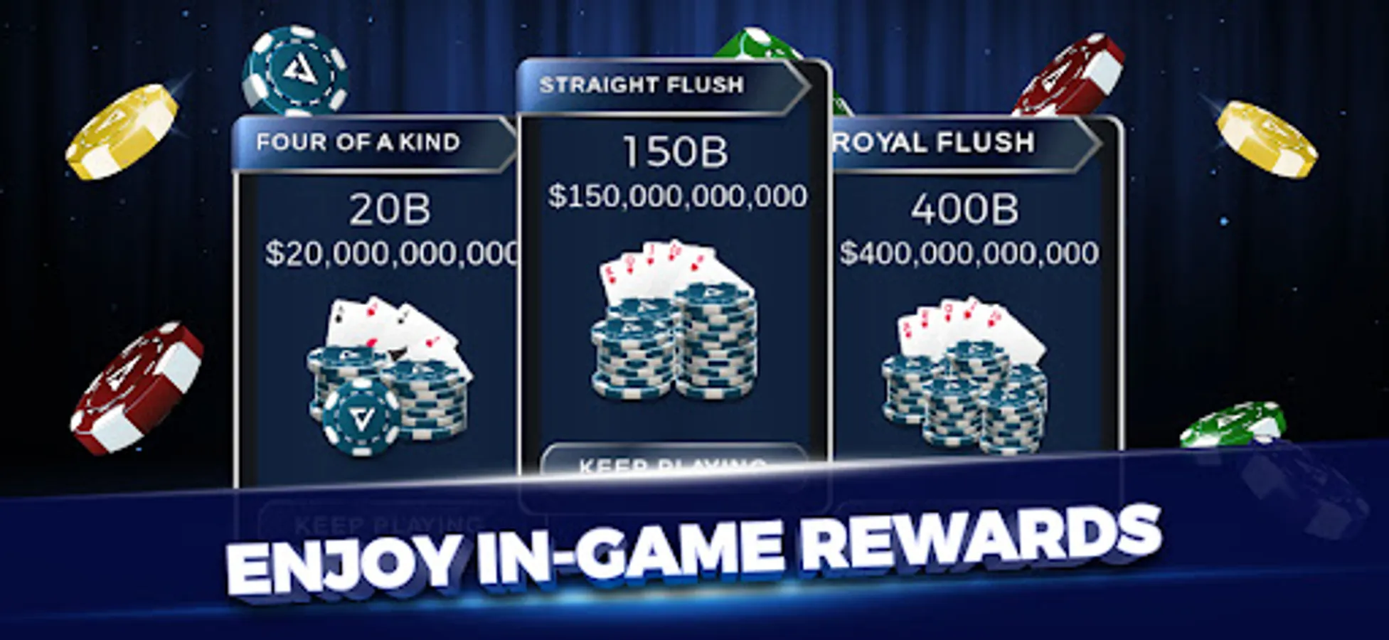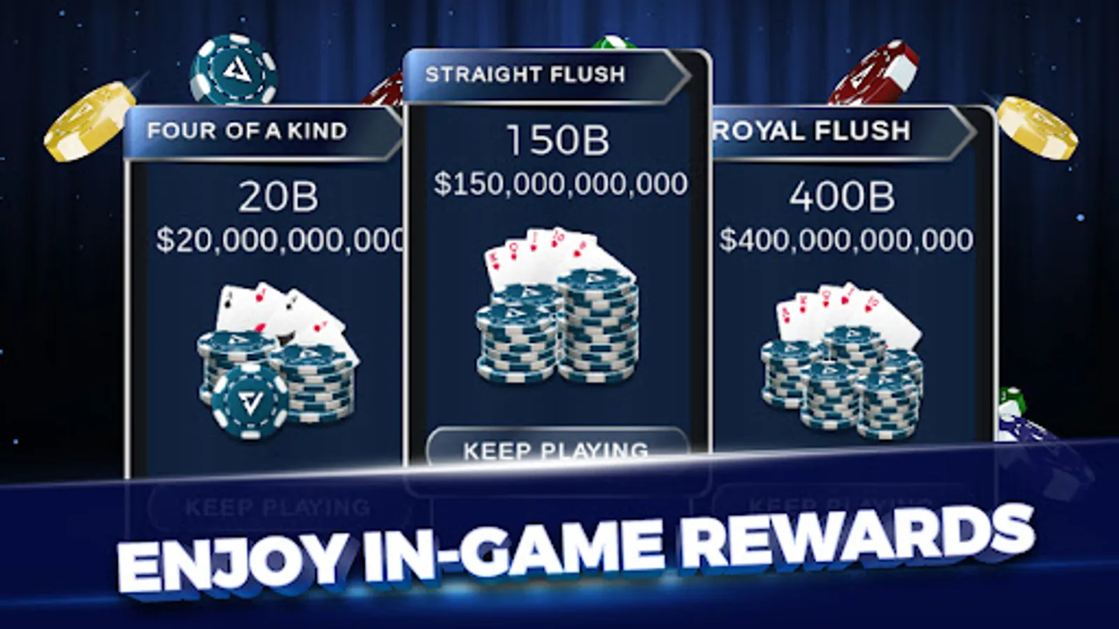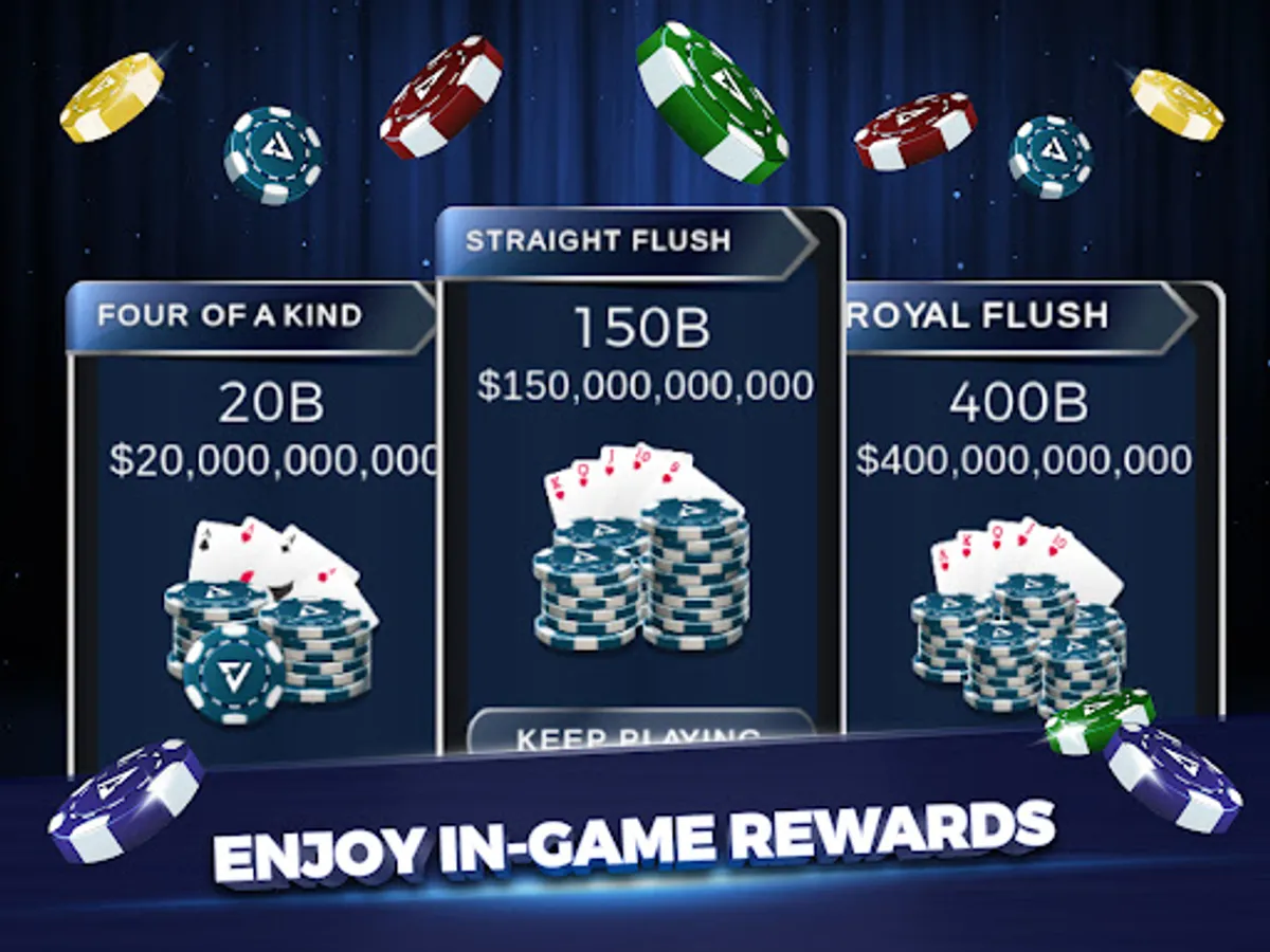 HIGH STAKES, BIG REWARDS: Play hard to win chips and hit a JACKPOT when you get dealt a four of a kind, straight flush, or royal flush hands. Not enough? Velo Poker rewards you with FREE chips each time you pass levels in the casino card game, or when you watch video ads.
