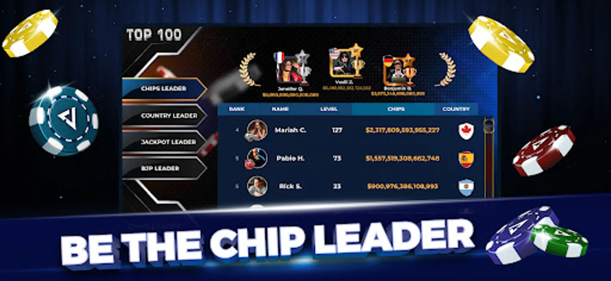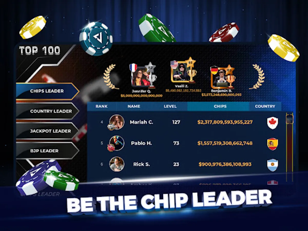 TEXAS HOLDEM TOURNAMENTS: Play poker in 5 or 9-person table rooms based on how many chips you have. Enjoy playing your favourite card game against opponents and get on the leaderboard with player and country based poker rankings.