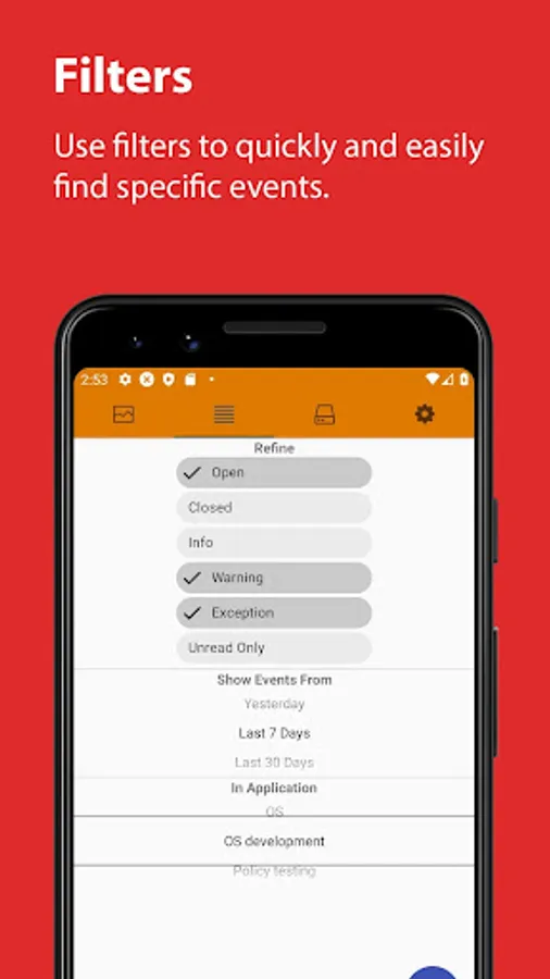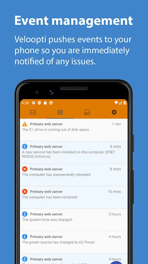 Ditch your email or SMS monitoring notifications by using the Veloopti app. Easily view new or open monitoring events right on your phone. Filter the events and hide the ones you aren't interested in.