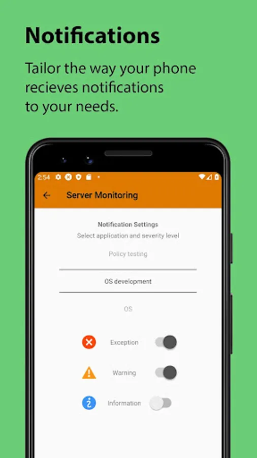 • Receive push notifications that are configured on a: per-organisation; per-application and per-severity basis