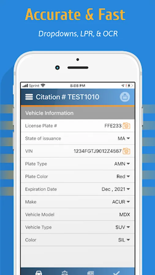 vCiteMobile is designed with the law enforcement officer in mind. Efficiency and accuracy are of primary importance and this app does not disappoint. The app utilizes license plate recognition and OCR technology to help quickly capture the license plates and VIN Numbers of the vehicles. Dropdown menus of vehicle makes, vehicle types, and vehicle colors make data entry quick and reduces errors.