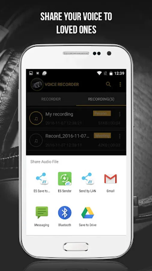 ► Share your recording files - The share option let users share their recording files, voice notes, memos so on through various available mediums like WhatsApp, Shareit, Gmail, bluetooth share and all the other sharing options on your phone.