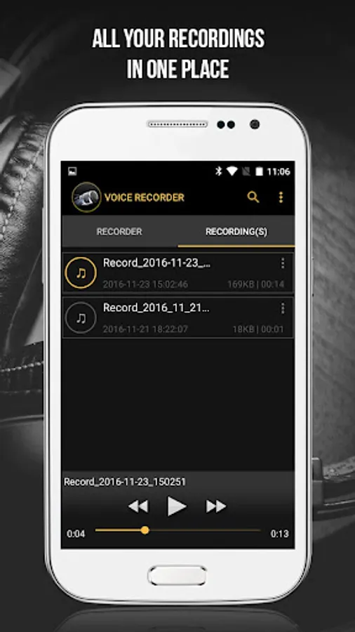 ► Recordings that you save- User can browse the list of all the saved voice recordings. You can play, pause, move forward/backward, or delete the recordings from the app interface itself.