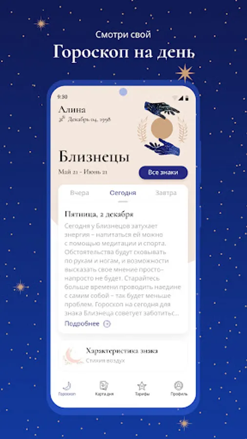 Tired of the endless search for answers to life's questions? It's time to turn your smartphone into a magical portal that will tell your fate and help you make important decisions. With Velstar you will know your personal horoscope and be able to draw tarot cards wherever you are!