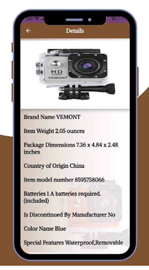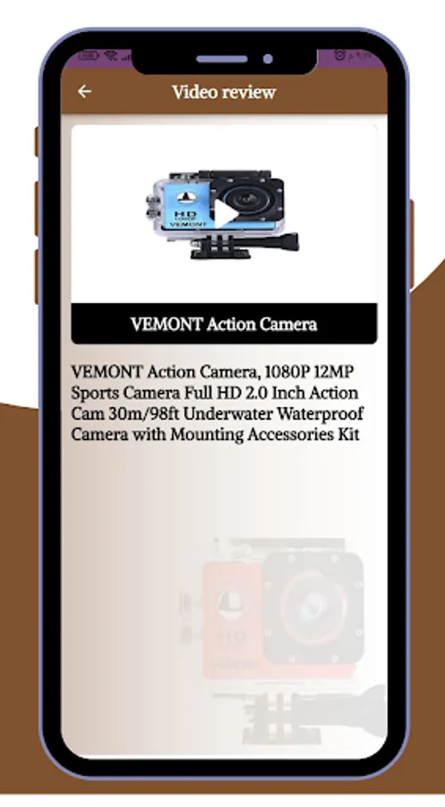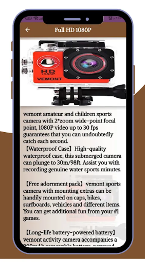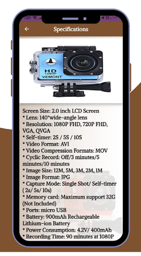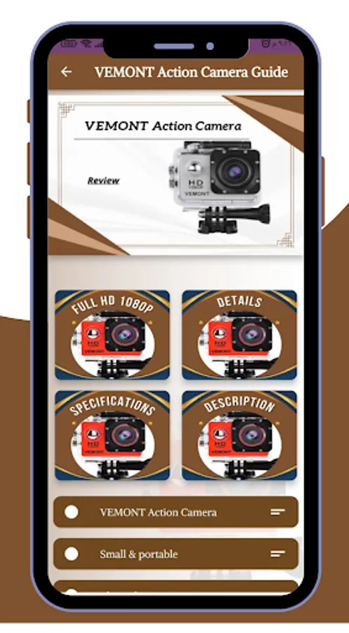 VEMONT Action Camera The application gives you specifications and images for a camera