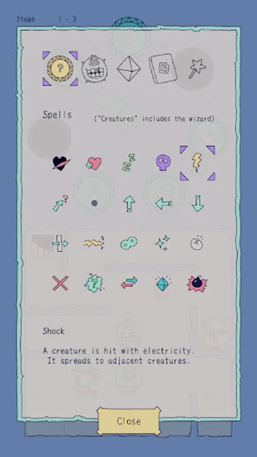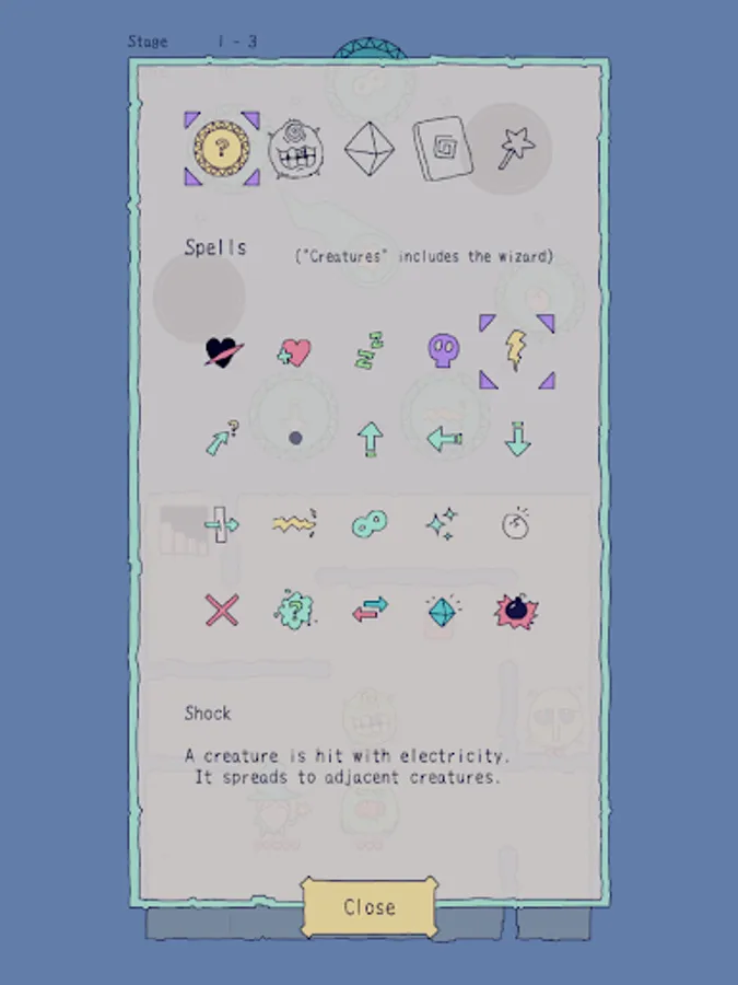 There are various spells, such as Hurt, Heal, Put to Sleep, Poison, Shock (with electricity), and many others. Spells can be used on monsters, but also on yourself if you so wish! Some other spells include Clone (play with multiple wizards!), Explode, Convert (get monsters on your side!), polymorph, and so on.