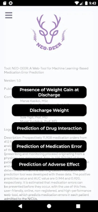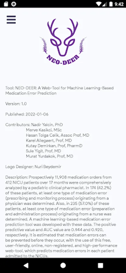 Tool: NEO-DEER: A Web-Tool for Machine Learning-Based Medication Error PredictionVersion: 1.0Published: 2022-01-06Contributors: Nadir Yalcin, PhD Merve Kasikci, MSc Hasan Tolga Celik, Assoc Prof, MD Karel Allegaert, Prof, MD Kutay Demirkan, Prof, PharmD Sule Yigit, Prof, MD Murat Yurdakok, Prof, MDLogo Designer: Nuri BeydemirDescription: Prospectively 11,908 medication orders from 412 NICU patients over 17 months were comprehensively analyzed by a pediatric clinical pharmacist. In 174 (42.2%) of these patients, at least one type of medication error (prescribing and monitoring process) originating from a physician was determined. Also, in 235 (57.0%) of these patients, at least one type of medication error (preparation and administration process) originating from a nurse was determined. A machine learning-based medication error prediction tool was developed with these data. The positive predictive value and AUC value are 0.944 and 0.920, respectively. It is estimated that medication errors can be prevented before they occur, with the use of this free, user-friendly, online, non-registered, and high-performance web-tool, which predicts medication errors in each patient admitted to the NICUs.