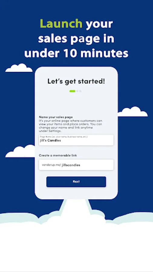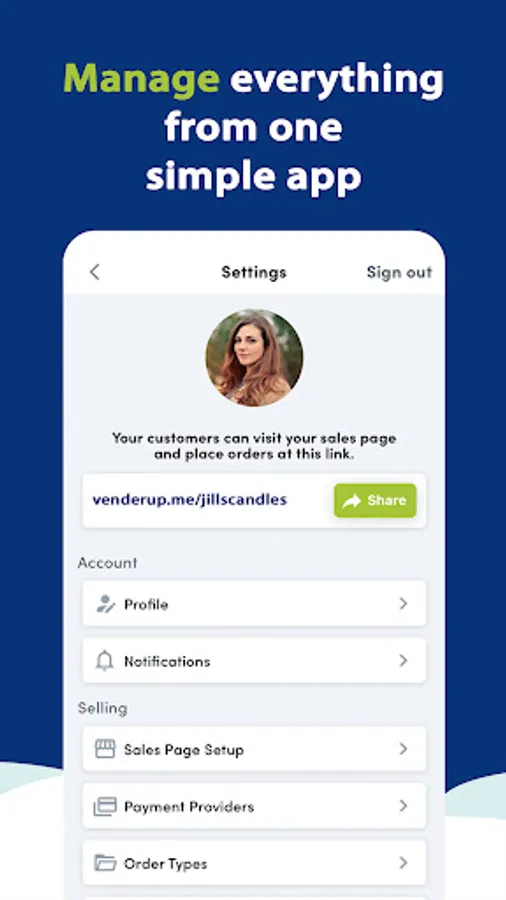 - your own personal link (ex. venderup.me/jillscandles)