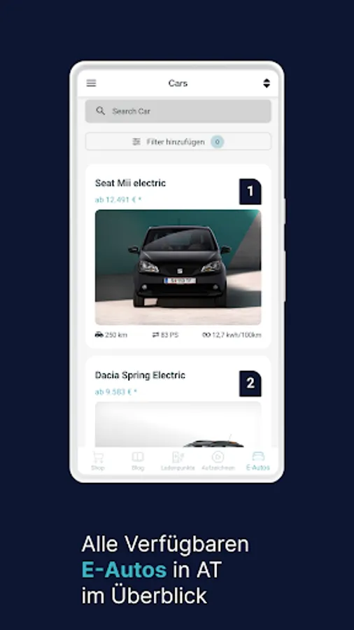 All available electric cars are included in Alveri, in addition home charging stations and a charging card with all public charging points in Austria & Germany are available to offer a carefree charging infrastructure. You can also find the latest subsidies for purchasing a car and charging infrastructure in our app.