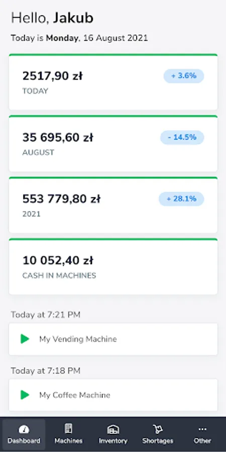 Get alerts when products are running low, analyze performance, send funds to machine, get a picking list online, connect any payment terminal - all in one place!