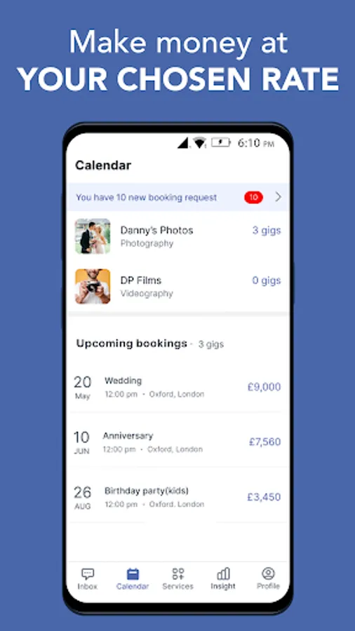 • Simply set your schedule and organisers will send you a request to accept their booking or instantly book you