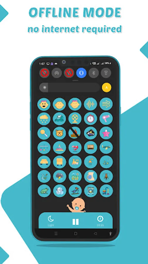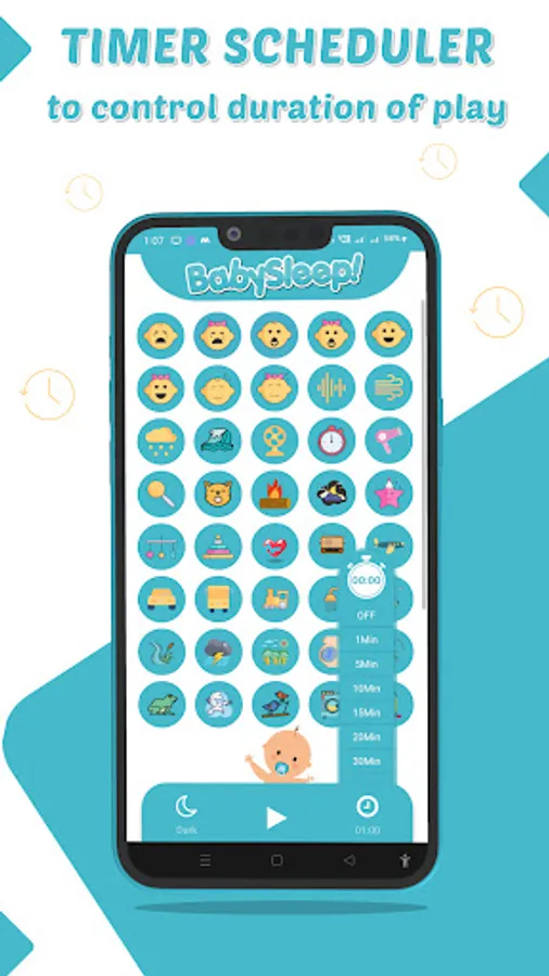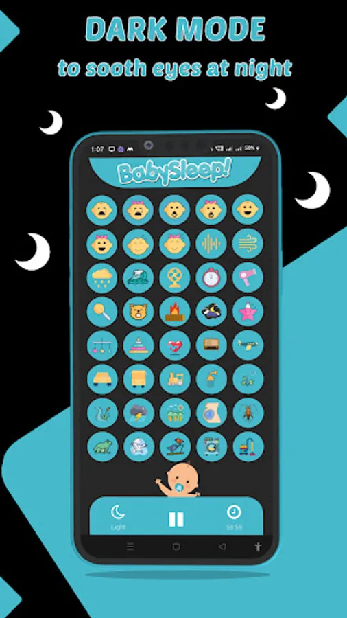 Using baby sleep is very simple: just put the phone at a suitable distance from the child, choose a sound and set the timer that turns off the application after a specified time. After a short time the child should calm down, stop crying and fall asleep.