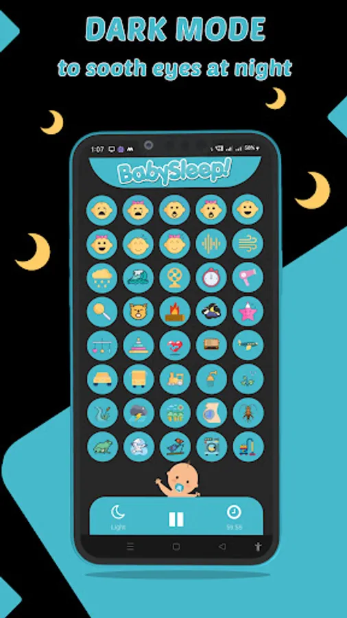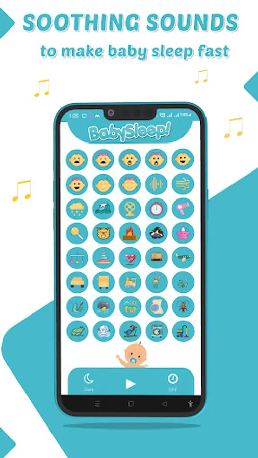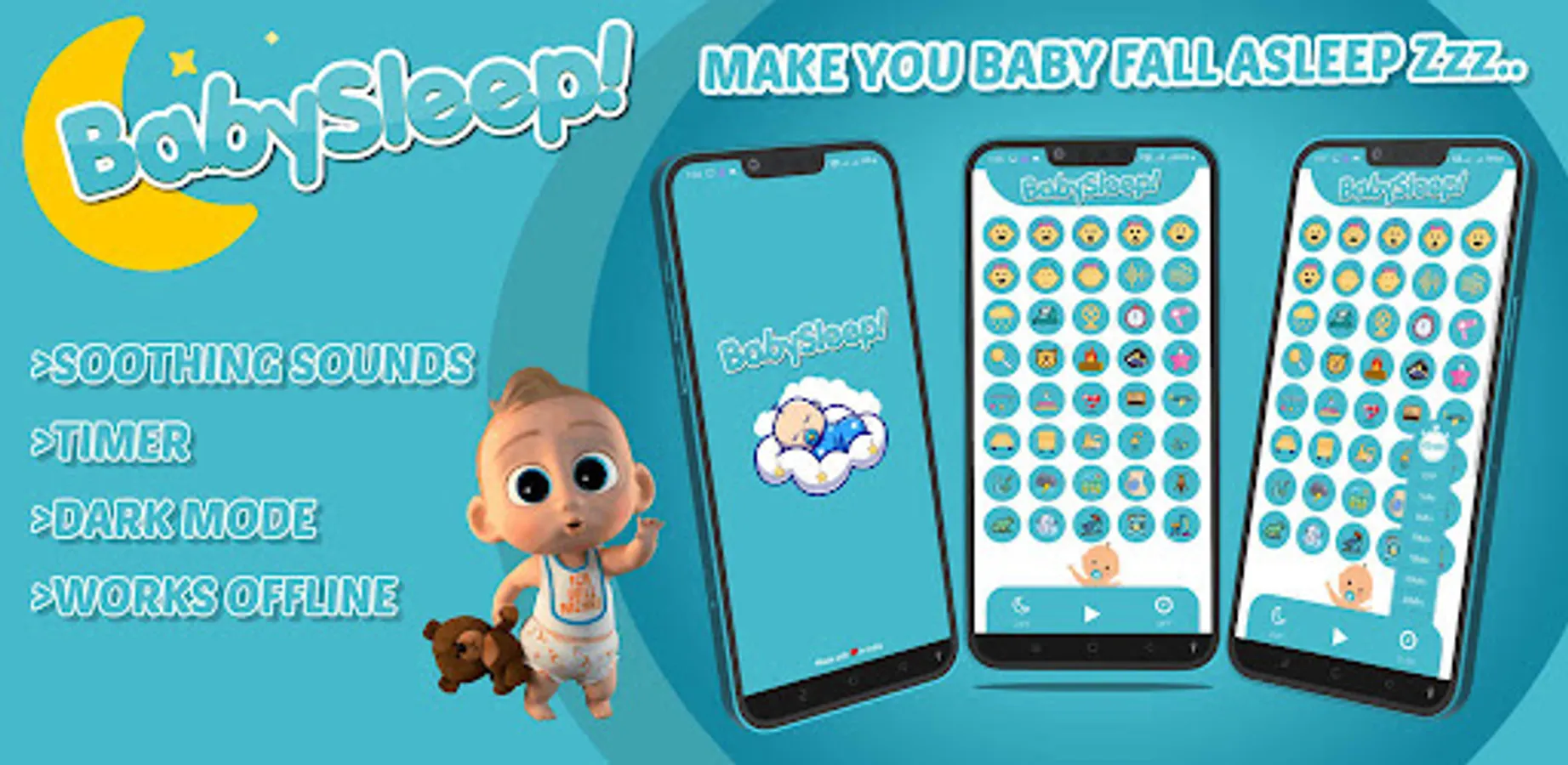 Using baby sleep is very simple: just put the phone at a suitable distance from the child, choose a sound and set the timer that turns off the application after a specified time. After a short time the child should calm down, stop crying and fall asleep.