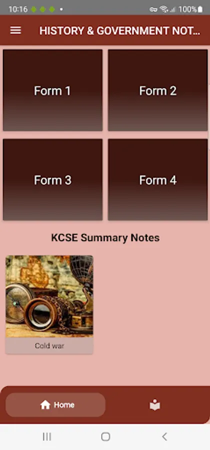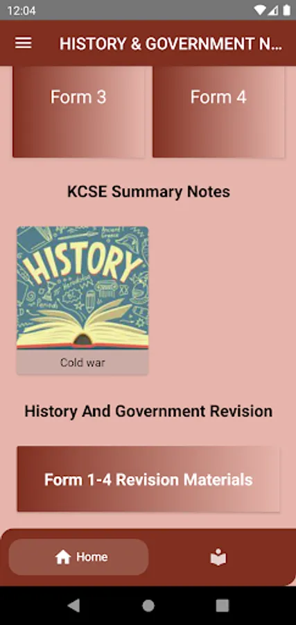 History: f1 - f4 Handbook features form 1 - form 4 History and Government KCSE standardized notes. The main objective of the application is to equip students and other users with the History and Government content. The application features the following topics: