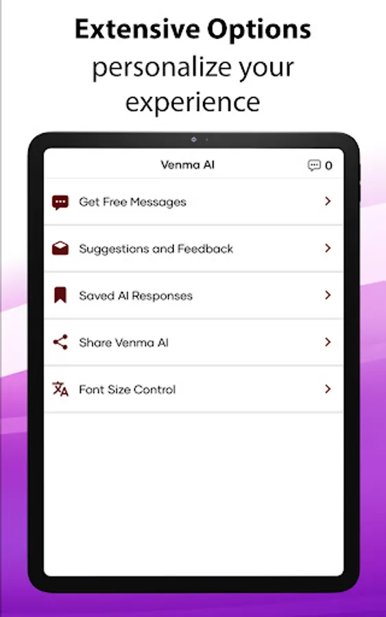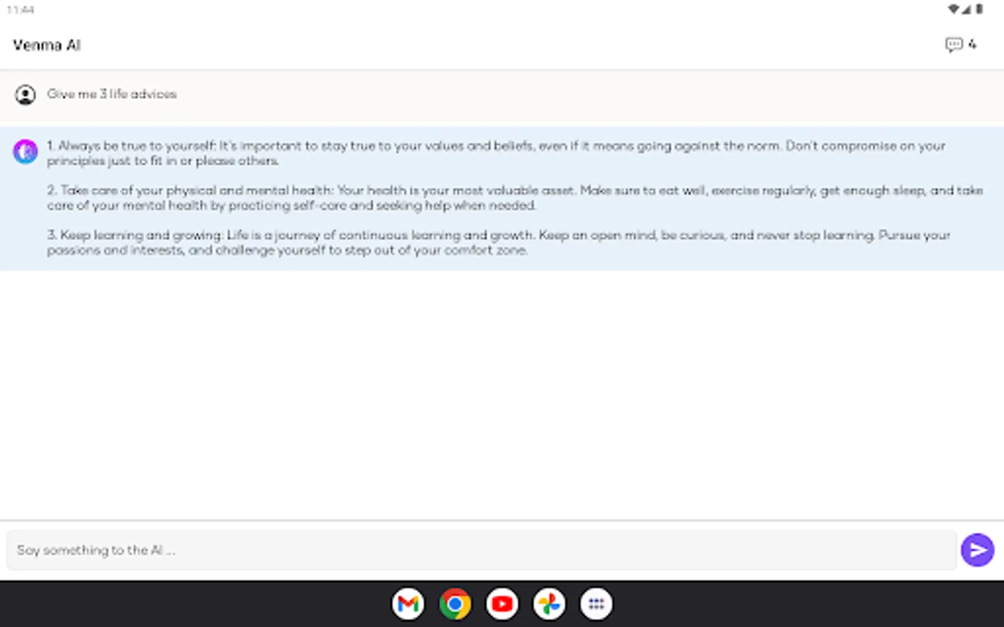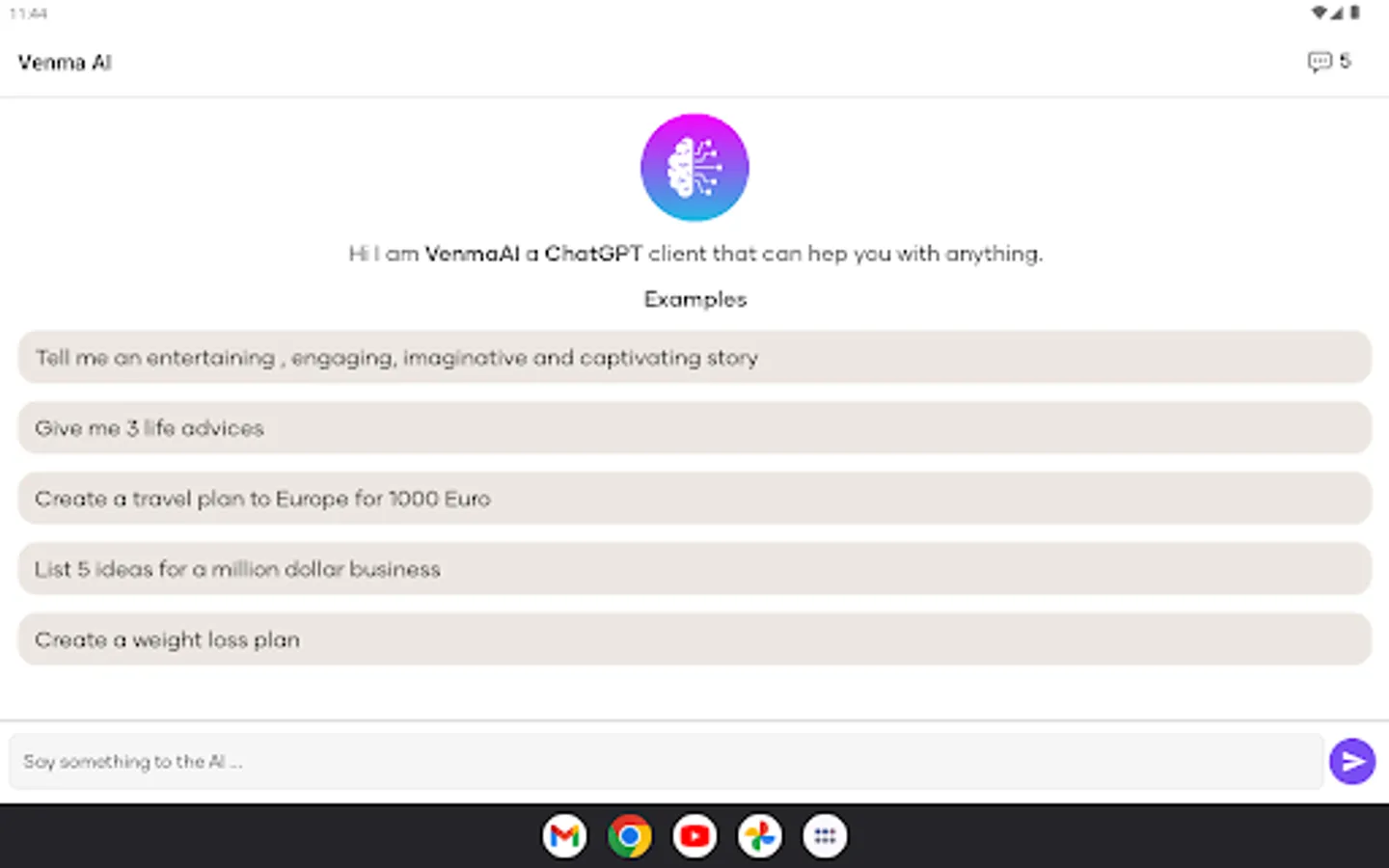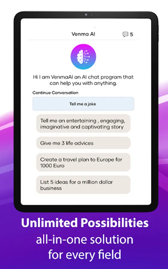 Venma AI is an innovative mobile app that harnesses the power of GPT technology to provide a unique chat experience. With VenmaAI, you can engage in natural and dynamic conversations with an AI-powered chatbot that is always learning and adapting to your preferences. Whether you're looking for a fun chat buddy, a virtual assistant, or just someone to talk to, VenmaAI has got you covered. Try it out today and see for yourself what makes VenmaAI the ultimate chat GPT client.