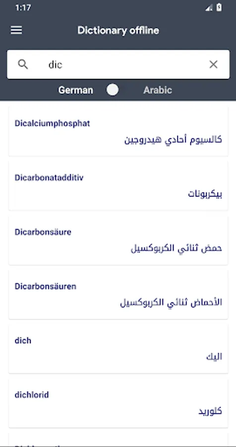 German-Arabic Dictionary translates words from Arabic into German or vice versa without the need for an internet connection for free. Contains more than 37 thousand words, the most common in the German and Arabic languages, to help you translate the basic daily texts and have a help in your studies. This dictionary is very useful for students who study the German language and for everyone interested in studying the German language in study or everyday life.