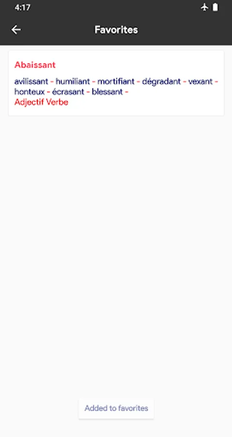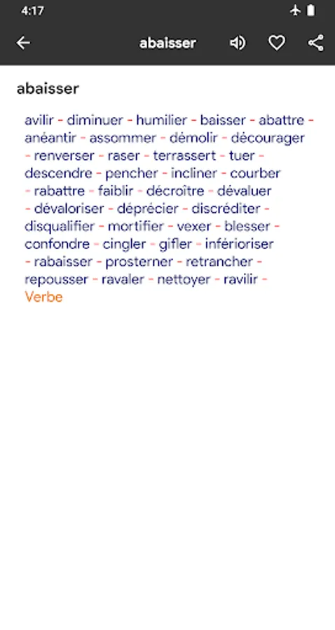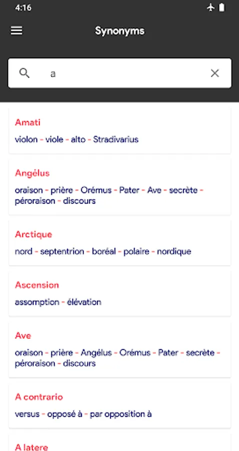 This app contains a lot of synonyms french offline or Dictionary french offline it contains 95,630 synonyms .Thesaurus contains antonyms. The Dictionary synonyms offline do not require an Internet connection .