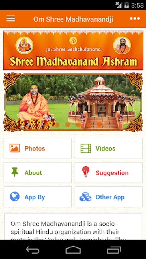 Mobile app for Shree Madhavanand Ashram community. Please download App and enjoy Photos, Videos and other content via mobile platform.