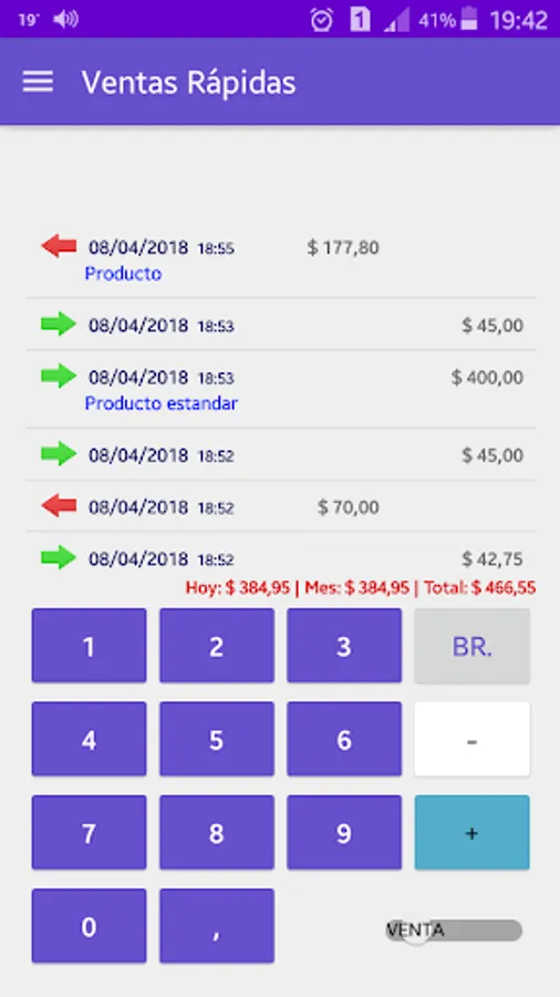 Quick Sales is an application designed to quickly and agilely register sales in businesses with intense movement such as kiosks, pantries, greengrocers or any other business. Its convenient interface allows this goal to be achieved without interrupting the flow of customer service and is as simple as using a calculator. You can record your sales or expenses anytime, anywhere. It does not require initial configurations or register accounts or users ... just download it and start entering your sales! Then Quick Sales will be in charge of informing you of your sales of the day, of the month, your earnings and you can view different reports to have full control of the movements of your business.