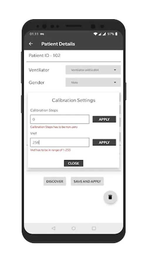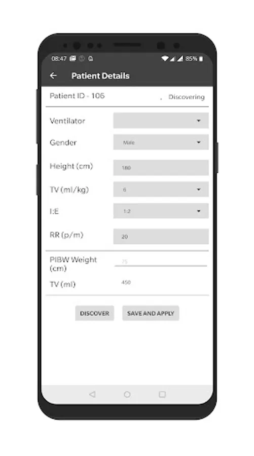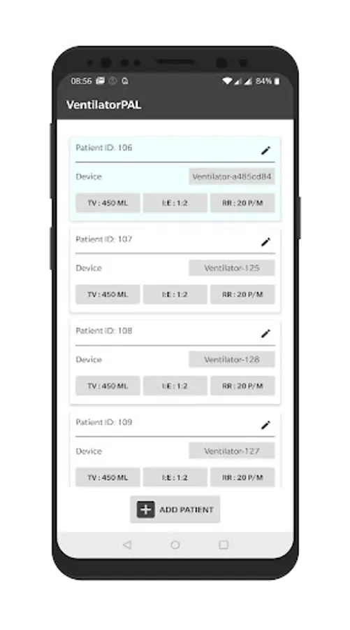 VentilatorPAL App is a simple and intuitive mobile app which helps an operator to set the Tidal Volume (TV), Inhale/Exhale ratio (I/E) and Respiratory Rate (RR) of the ventilator. Simple and intuitive Mobile app provides access to additional settings which include the length and gender of the patient. App allows user to create a patient profile and then app can automatically calculate the Tidal Volume based on the patient profile and apply the settings to the Ventilator device.