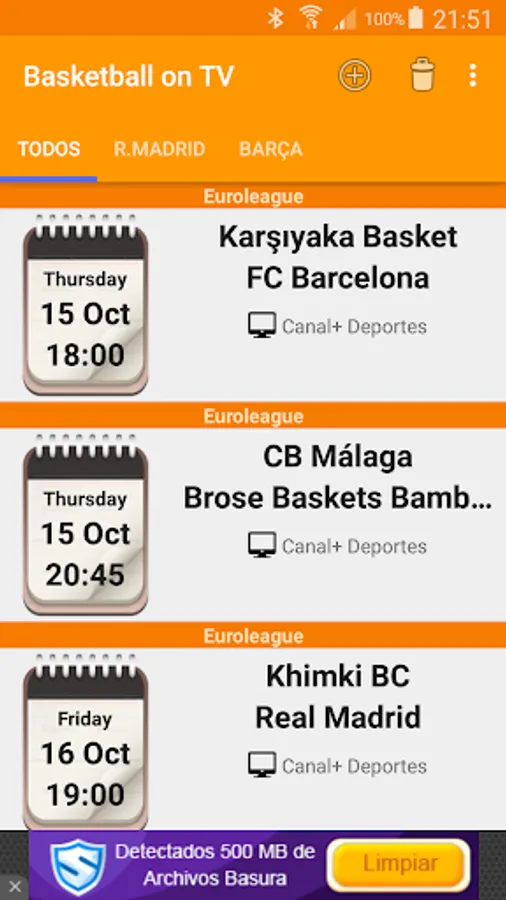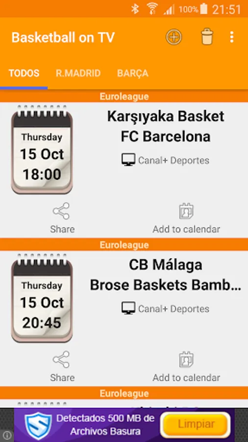With this great app you'll have an updated list of all next basketball matches events of the Spanish clubs in the main leagues: Liga Endesa, Euroleague, Eurocup, King's Cup, Eurobasket as well as friendly and preseason matches.