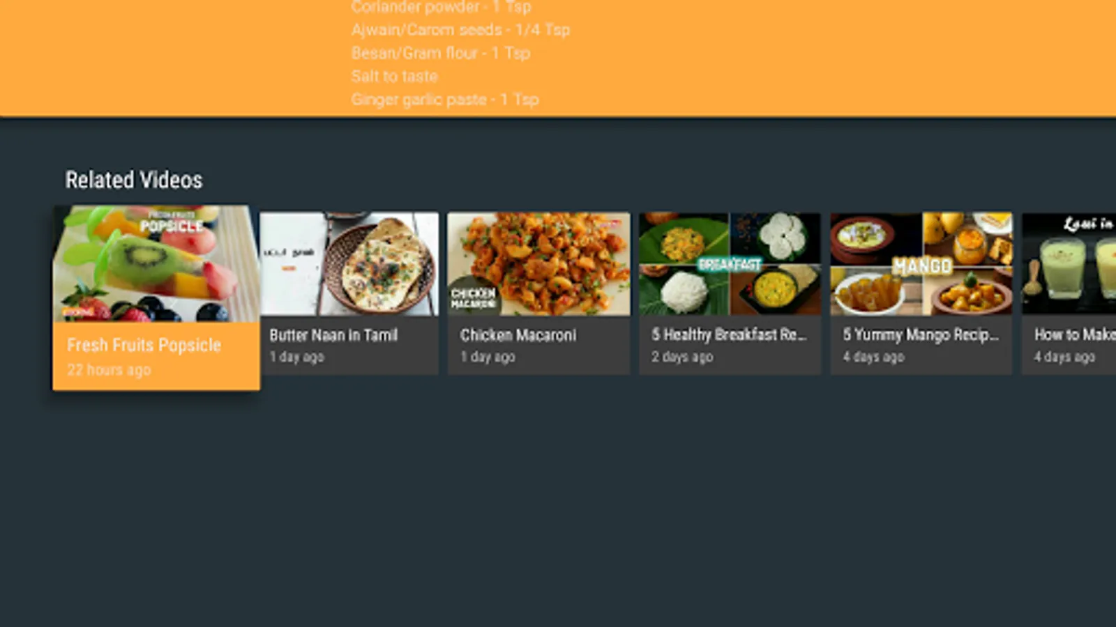 Videos contain ingredients, recipe and step by step instructions from our host. Users can search for recipes using the search option on the app or browse and choose from the playlist.